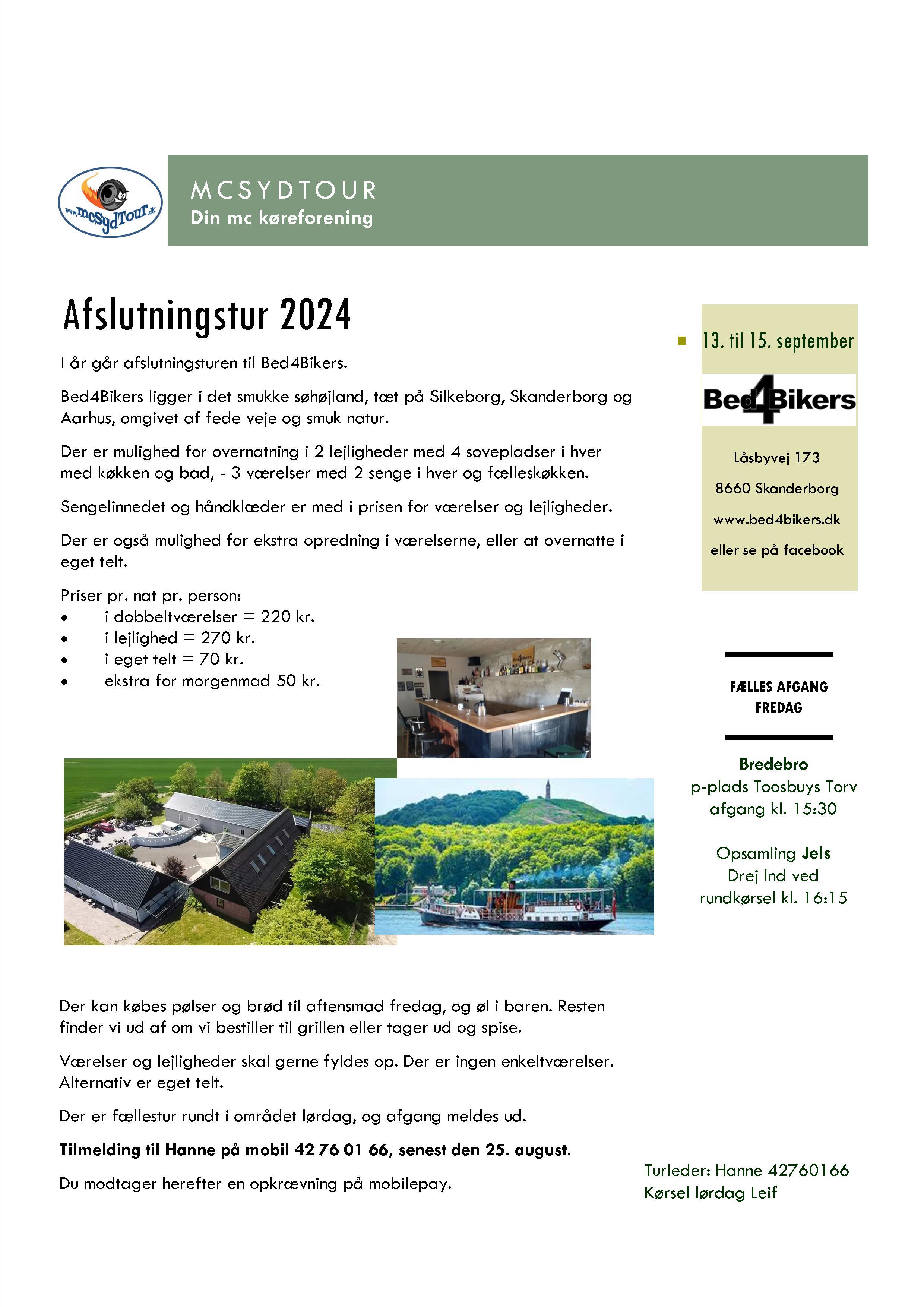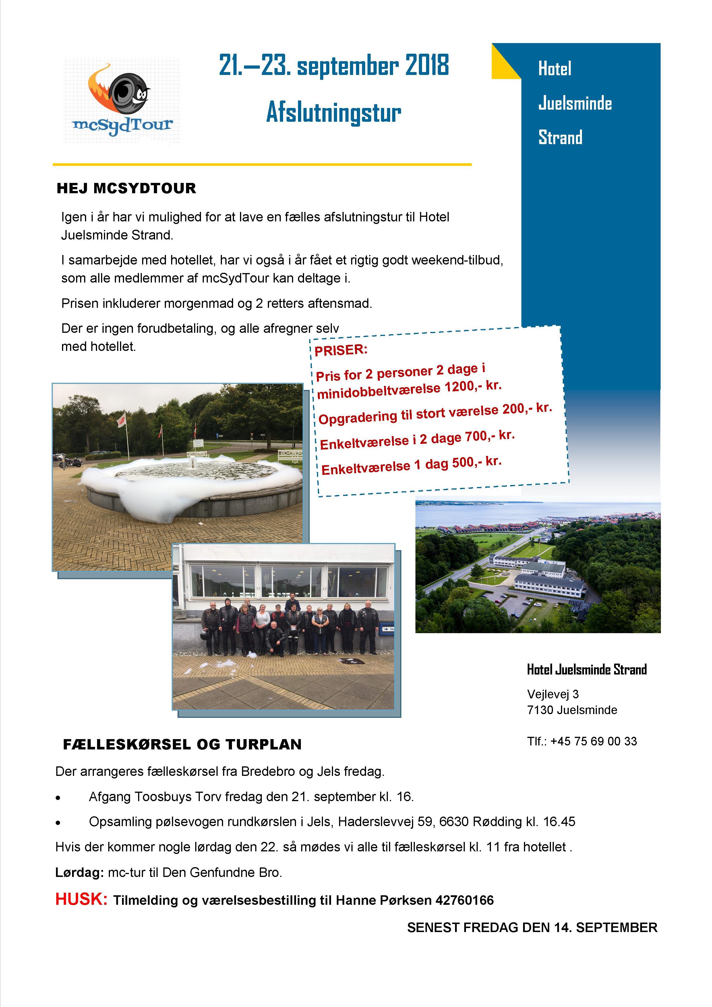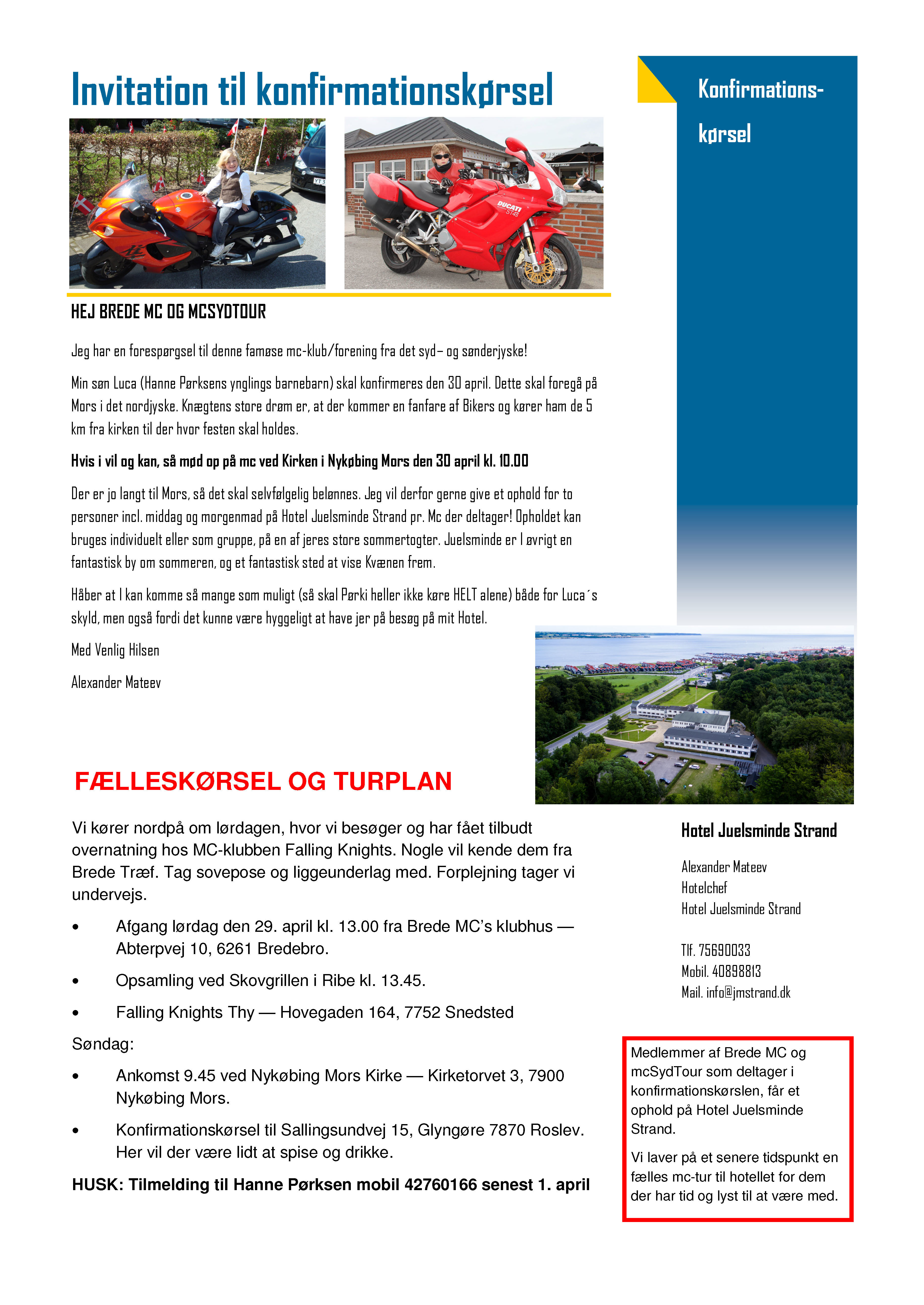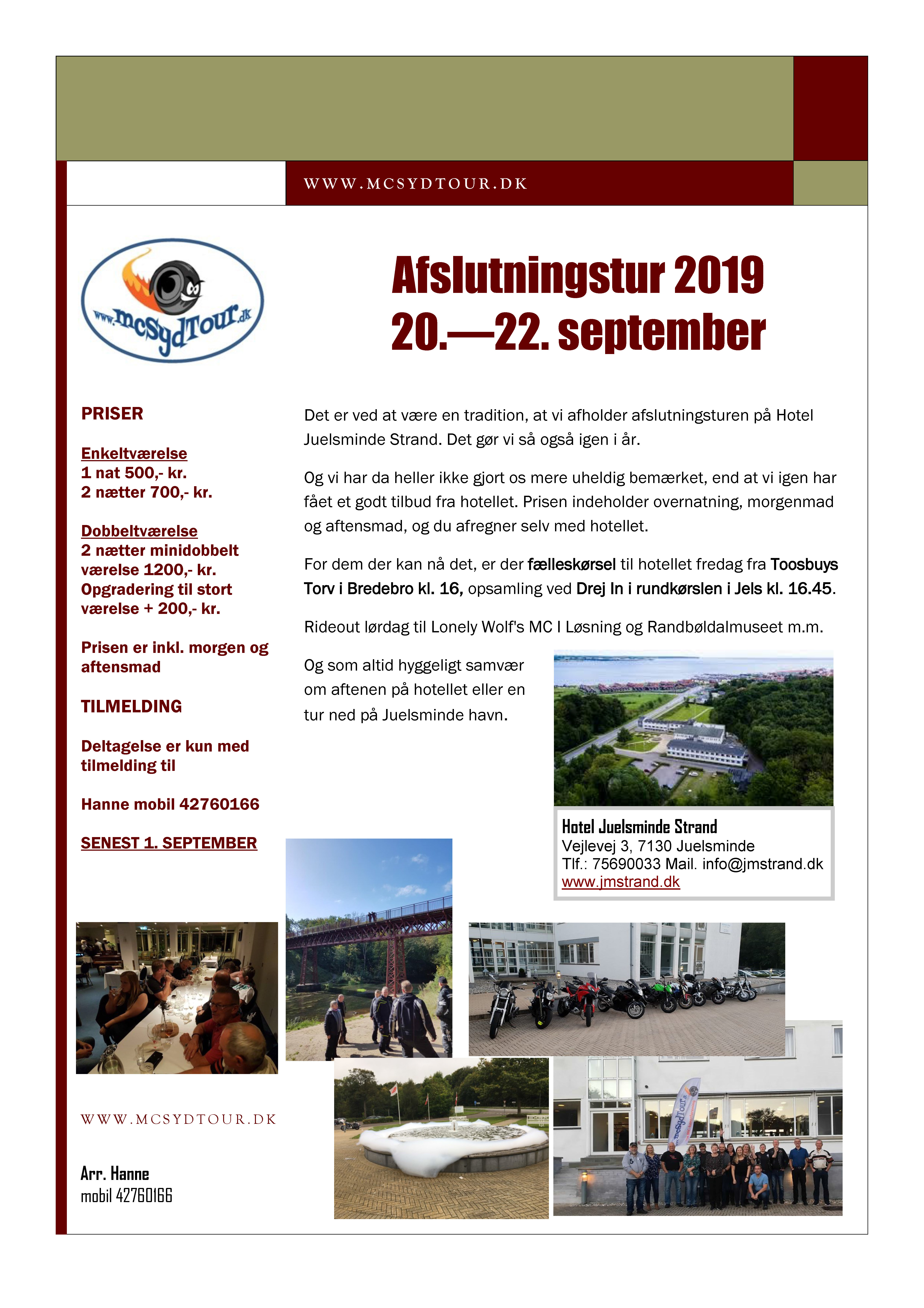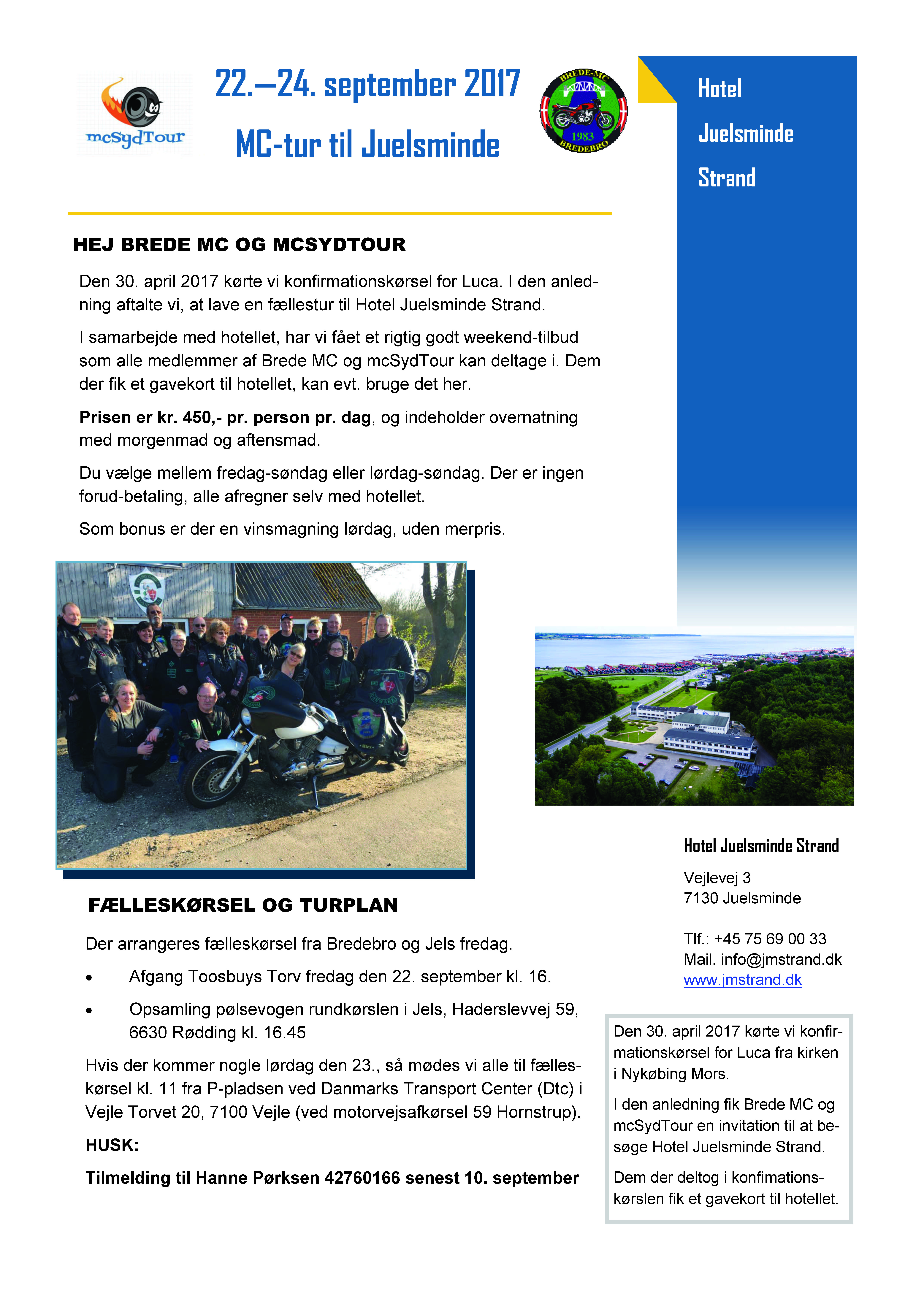 I samarbejde med hotellet, havde vi fået et rigtig godt weekend-tilbud som alle medlemmer af Brede MC og mcSydTour kunne deltage i. En god tur, med god mad, god betjening og hyggeligt samvær samt et kanon vejr lørdag, hvor vi tog en mc-tur rundt i bakkerne omkring Vejle.