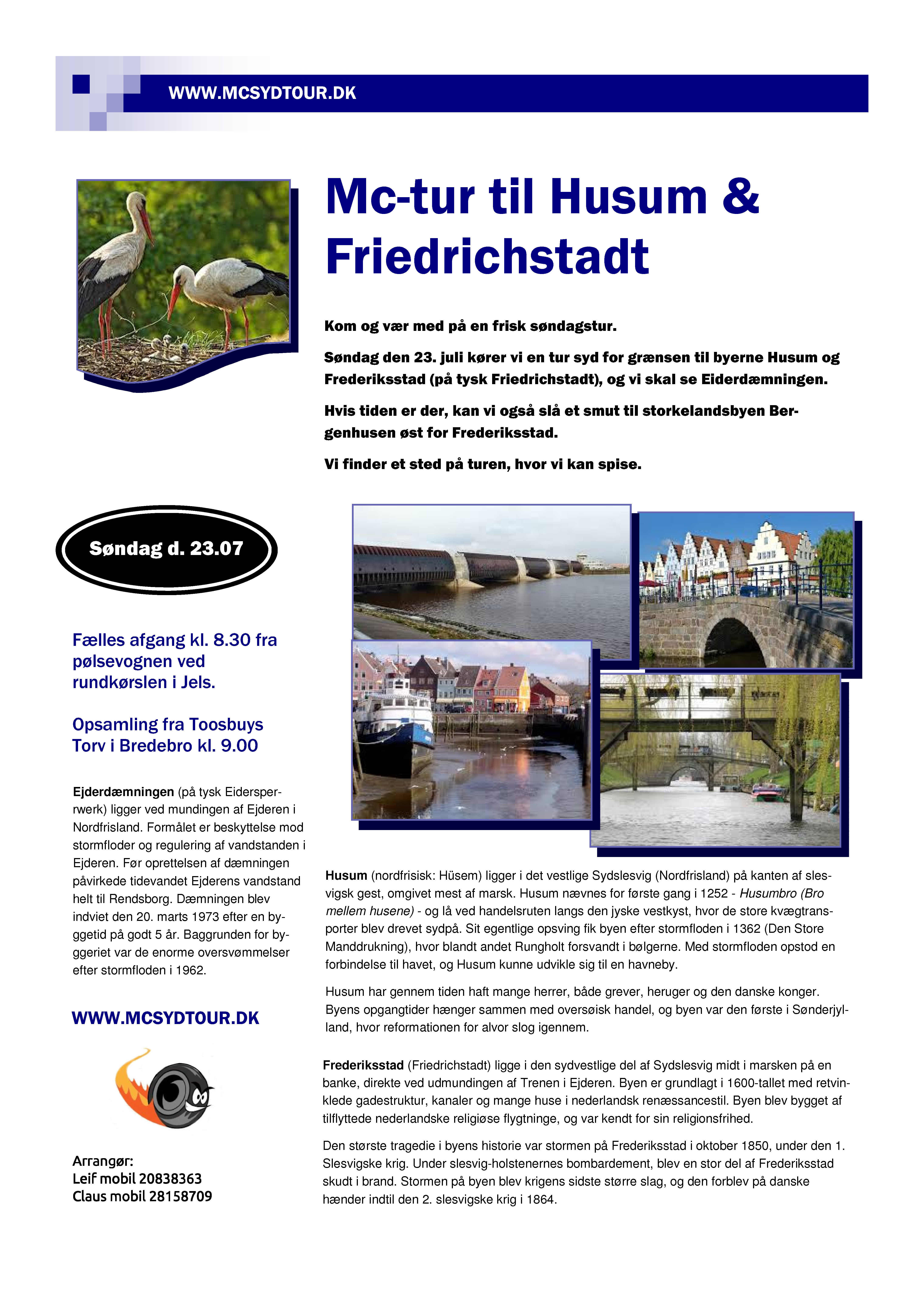 I maj blev der kørt en weekendtur med overnatning syd for grænsen. Turen gik til Husum, Eiderdæmningen, Frederiksstad og storkelandsbyen Bergenhusen. Efter en overnatning i Sleswig og hyggeligt samvær, besøgte vi Gottorp Slot som nettop også havde et lokalt marked.