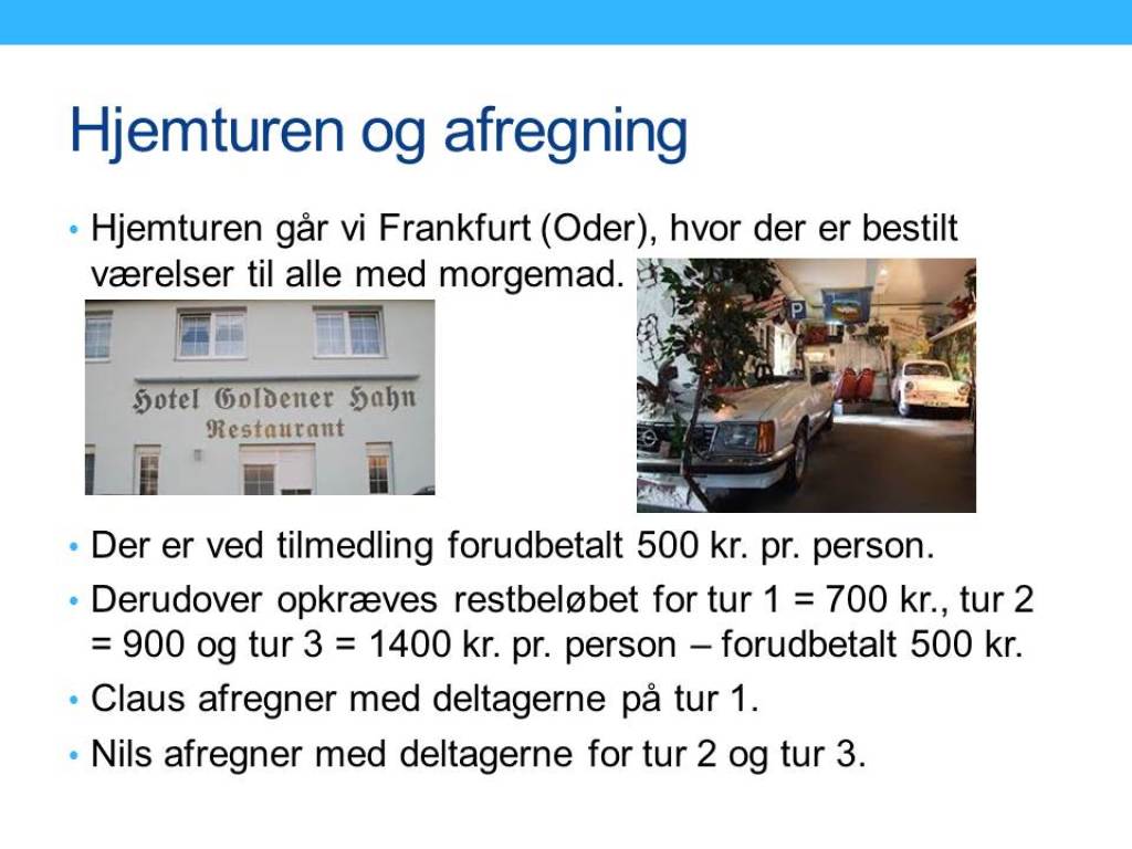 Hjemturen var med overnatning i Frakfurt (Odder) på Der Goldene Hahn, hvor vi alle igen blev samlet til fællespsining og gruppefoto af hele banden. Resten af hjemturen til DK den 8 juli, og alle kom godt hjem.