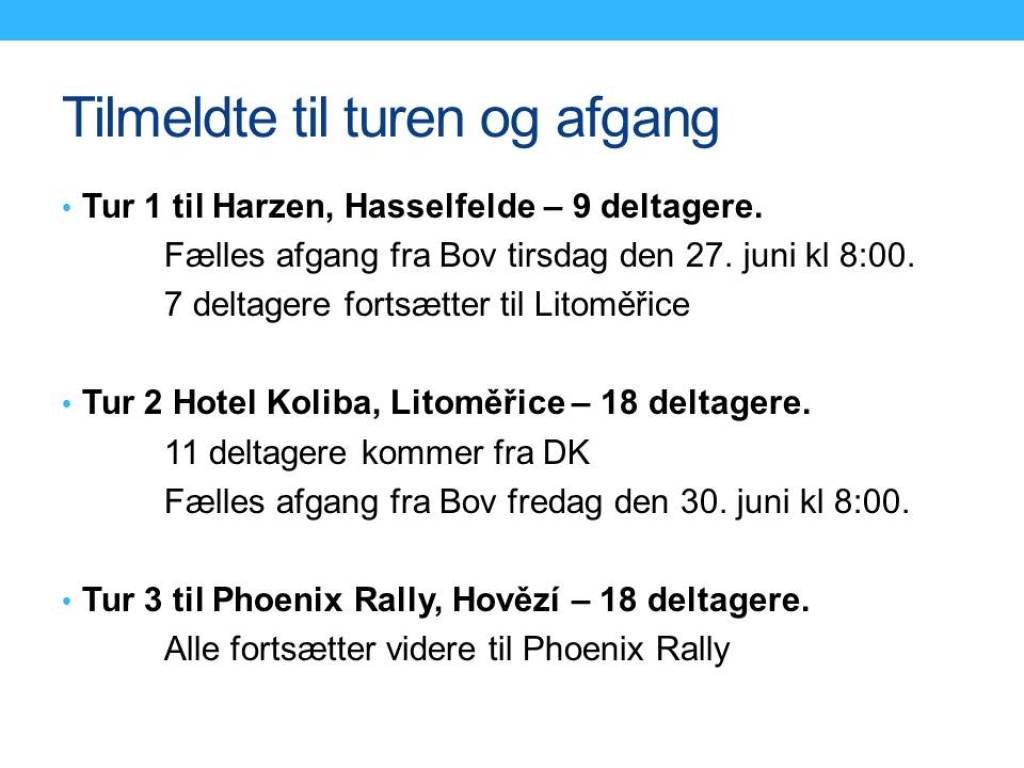 Fredag den 30. juni kom nogle fra Harzen (tur 1) og andre direkte fra Danmark til hotellet i Litomerice. De sidste kom søndag og så var 15 mc og 18 personer.