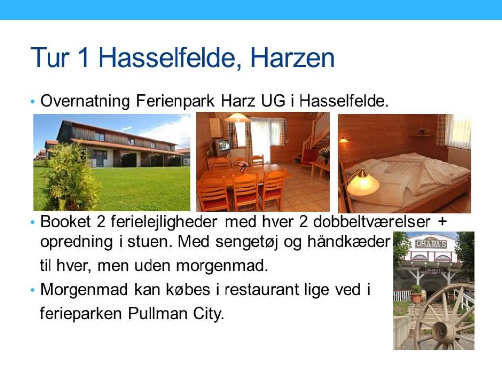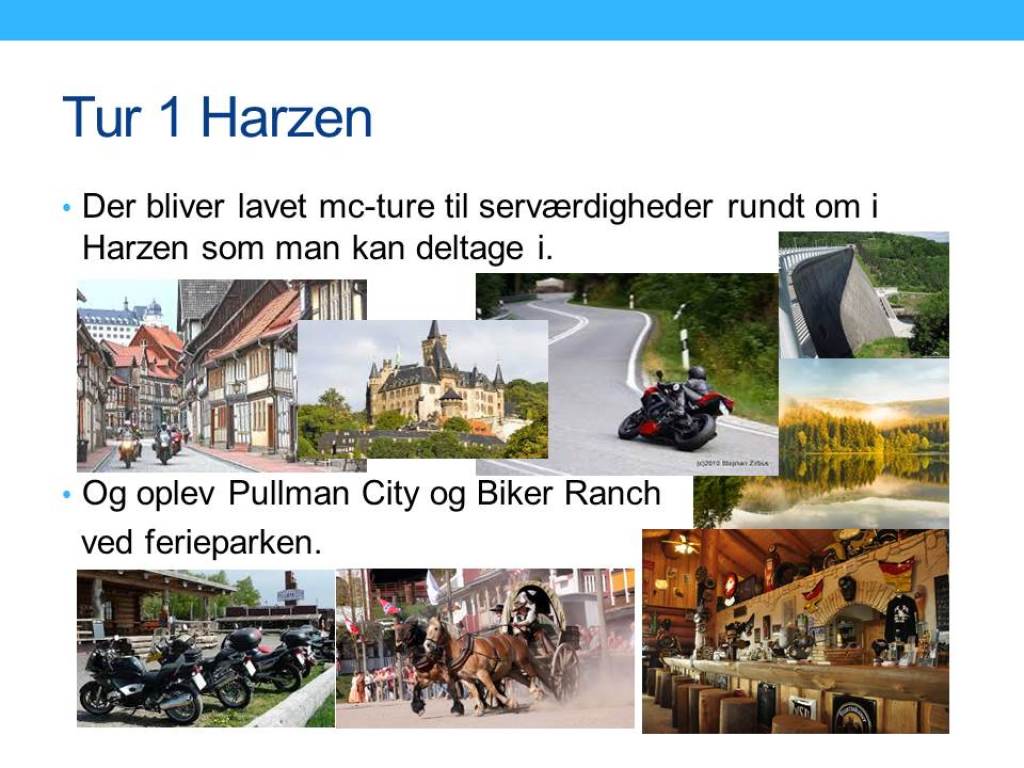 Vi kørste ture til bla. Rappbodetalsperre, Wernigerode, kørte op ad Kyffhäuser og besøgte Barbarossahöhle. Ellers var vi i Pullman City, i Bikerbaren og til rockkoncert, da der just var optræk til Boss Hoss træf der. Fredag den 30. juni kørte de fleste videre til Tjekkiet (Tur 2).